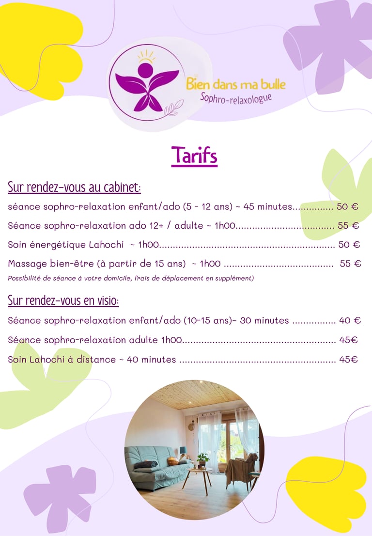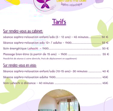 Je vous reçois dans un cadre chaleureux, propice à la détente, dans mon cabinet. Je propose également des séances de relaxologie en visio, selon vos préférences.